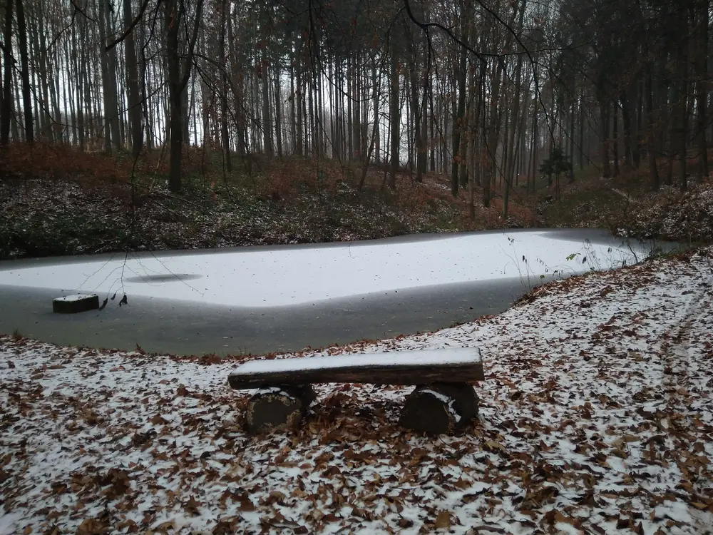 Trasu mi po 2 km protne silnice a 300 m jdu po ní. Naštěstí zde není tak velký provoz. Každopádně mohla by se tady vymyslet příjemnější alternativa. Pak zelená značka pokračuje vpravo lesíkem a po pár krocích vidím první z Valšovických jezírek. Jsou celkem tři. U největšího se nachází altánek. S napůl zamrzlou temnou vodní plochou, spadaným listím a sněhovým popraškem na mě místo působí tajemně a magicky. Poprvé jsem tady byla před dvěma lety s kamarádkou. Tohle místo mě nadchlo a jeho kouzlo zůstalo takové, jaké si ho pamatuji.